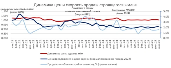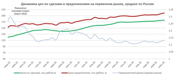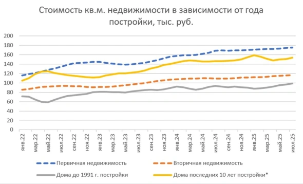 В исследовании указывается, что разрыв в стоимости 1 кв. м в новостройках и на вторичном рынке по итогам июля 2025 года составил 51%. «Эта цифра обусловлена почти исключительно большой и даже растущей долей жилья советской постройки в продажах», — пояснили аналитики, добавив, что современная вторичка, построенная в пределах десяти лет до даты сделки, лишь на 13% уступает в цене первичному жилью.