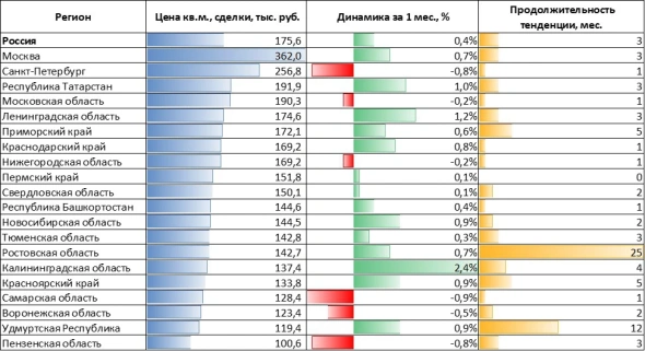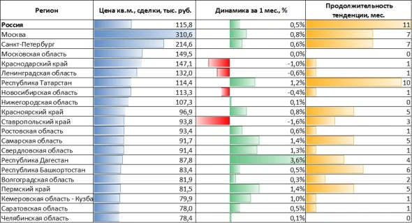 Рост цен отмечен в большинстве крупнейших регионов, в числе лидеров — Республика Дагестан (3,6%), Самарская область (1,4%) и Пермский край (1,4%). «В Москве цены выросли на 0,8%, в Санкт-Петербурге — на 0,6%. Для обоих городов это уже седьмой месяц роста подряд», — отмечается в исследовании.