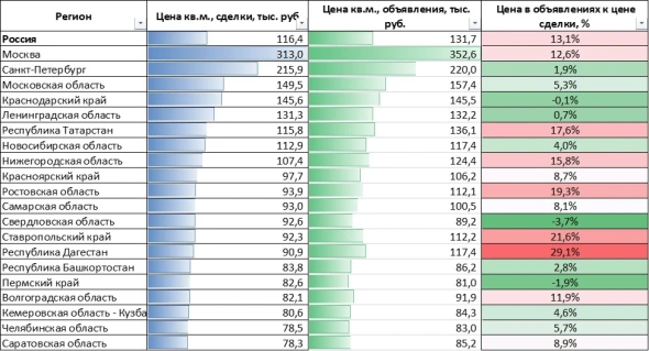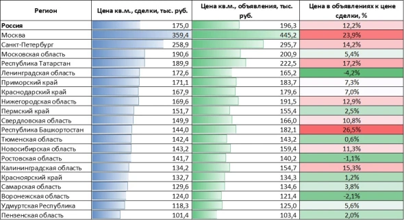 Самые высокие значения этого показателя отмечены в Москве (22,1%), Калининградской (20,8%) и Нижегородской (19,6%) областях, Санкт-Петербурге (18,6%) и Республике Татарстан (14,7%). Цена сделок превысила цены в объявлениях в трех регионах: Ленинградской (на 4,2%), Воронежской (на 2,1%) и Ростовской (на 1,1%) областях. «Учитывая хронологическое отставание публикации объявлений от сделок по ним, можно предположить, что цены в этих регионах перейдут к снижению», — прогнозируют в «Домклик».