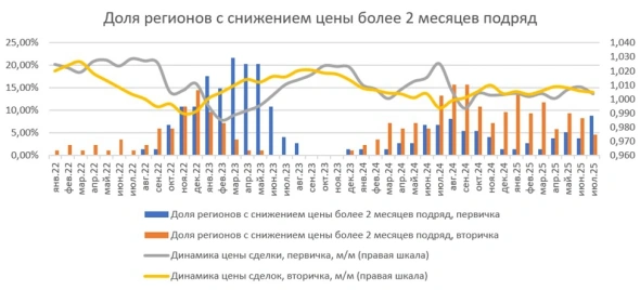 Эксперты обращают внимание, что на рынке новостроек в июле увеличилось число регионов, где цены на жилье снижаются от трех месяцев и более. На вторичном рынке число таких регионов, напротив, сократилось. «Для первичного рынка это самый высокий показатель с июня 2023 года, что создает предпосылки для локальных кризисов спроса», — подчеркивается в исследовании.