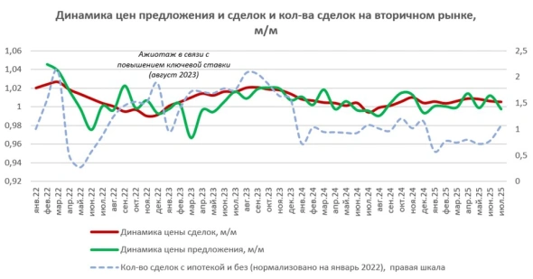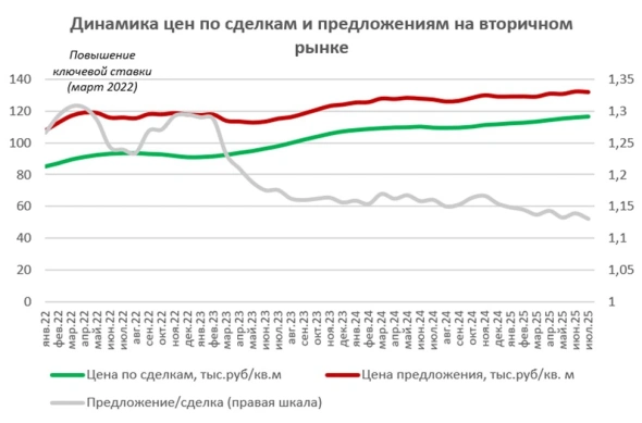 Данные ЦФА, подготовленные на основе ипотечных сделок Сбербанка, показывают продолжение тенденции медленного роста цен. В июле средняя стоимость 1 кв. м на вторичном рынке выросла на 0,5%, до 116,4 тыс. руб. «Рост цен продолжается с сентября 2024 года. За год после отмены программы «Господдержка-2020» цены выросли на 6,5%, быстрее роста цен на первичном рынке (4,2%), но ниже инфляции», — рассказали эксперты, отметив, что цены на готовое жилье продолжают сокращать отставание от первичного рынка, вызванное большими объемами сделок по льготным программам в период с 2020 по 2024 год.
