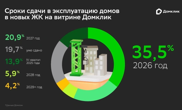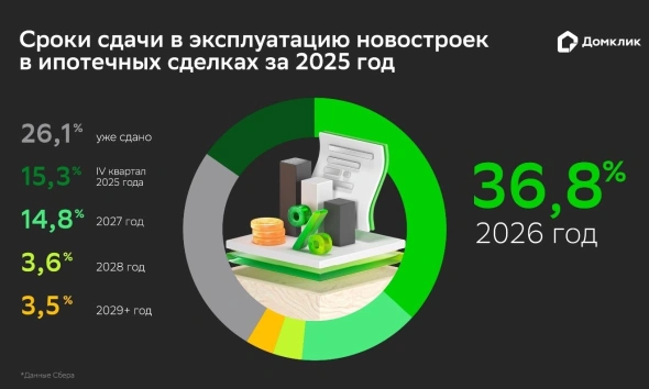 Что касается предложения новостроек, то чуть больше трети квартир, выставленных на продажу на витрине «Домклик», находится в новостройках, уже введенных в эксплуатацию или которые должны быть достроены до конца года. Почти столько же проектов (35,5%), где куплены новые квартиры в ипотеку, будет сдано в 2026 году. Еще 20,9% квартир будет готово к заселению в 2027-м. «Таким образом, большая часть лотов — почти 90% — имеет горизонт сдачи в эксплуатацию не больше трех лет. Только 10,1% будет сдано после 2027 года, из них 4,2% — в 2029 году или позднее», — пояснили аналитики «Домклик».