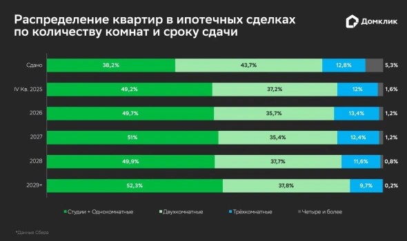 Аналитики «Домклик» отмечают, что количество комнат в ипотечных квартирах нередко связано со сроком сдачи новостроек. Например, небольшие квартиры (однушки и студии) в уже сданных домах занимают 38,2% от ипотечных сделок, на двухкомнатные квартиры приходится 43,7%, а оставшаяся часть — на более просторные лоты (от трех комнат и больше).