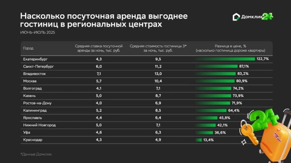 В «Домклик» также отдельно проанализировали цены на краткосрочную аренду и бронирование гостиниц в городах-миллионниках. По всей выборке посуточный наем жилья также оказался дешевле размещения в отелях. Лидером по ценовому разрыву стал Екатеринбург с разницей в 122%: средняя цена номера в гостинице в городе составляет 9,5 тыс. руб. за ночь, средняя ставка аренды — 4,3 тыс. руб. в сутки.