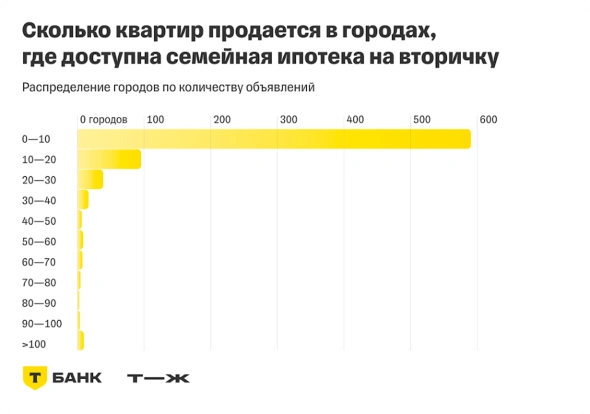 Предложение на вторичном рынке, подходящее под семейную ипотеку, в рассматриваемых городах сильно ограничено. Так, согласно исследованию, в 590 городах (или почти в двух третях) в продаже представлено не более десяти квартир, подходящих под условия семейной ипотеки. Из них в 193 городах — 21% — таких предложений нет совсем.