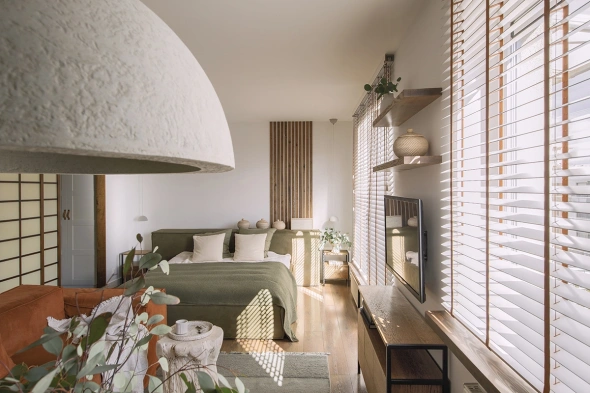 Смешение стилей приводит к образованию новых и запоминающихся приемов. Например, стиль джапанди (japandi) — это смешение философии скандинавского стиля и эстетики японского, замечает Анна Доброковская. В этом стиле используются только натуральные природные оттенки: черный, коричневый, темно-зеленый или серый. Главный принцип освещения — наполнить комнату светом и простором, поэтому используются панорамные, ничем не завешенные окна. А из материалов используют лен и хлопок. При этом текстиль не должен быть отглаженным, так как складки или заломы придают интерьеру шарм.
