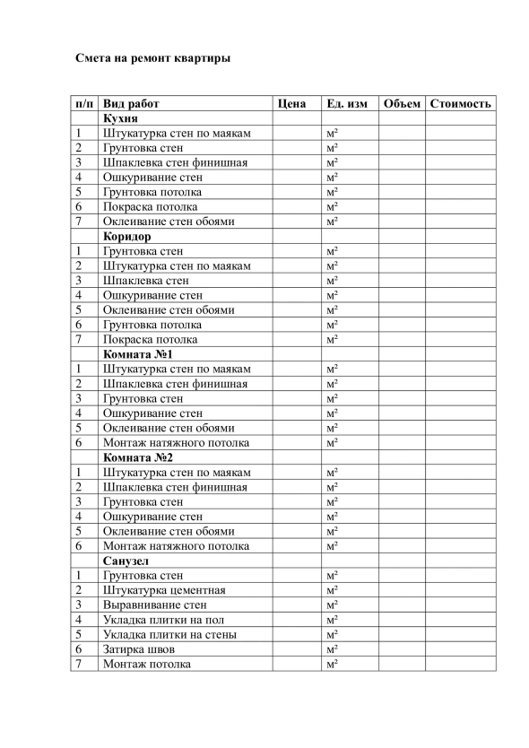 - составление итогового документа. Надо оформить смету с разбивкой по помещениям и видам работ с указанием количества, стоимости и сроков выполнения.