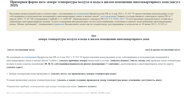 Акт составляют в двух экземплярах. В нем указывают ФИО того, кто обратился, и мастера, проводившего обследование. В документе прописывают время и причину обращения, в него же заносят результаты замеров: инспектор измерит температуру воздуха, проверит, нет ли утечек тепла по вине жильца (например, открытое настежь окно). Температуру воздуха измеряют во всех помещениях на расстоянии в полуметре от радиаторов и на высоте метр от пола. Обследование проводят с помощью прибора, прошедшего поверку. Информацию об этом также заносят в акт. Если нарушение выявлено, коммунальщики должны устранить его и провести повторную экспертизу, которая подтвердит, что нарушение исправлено.
