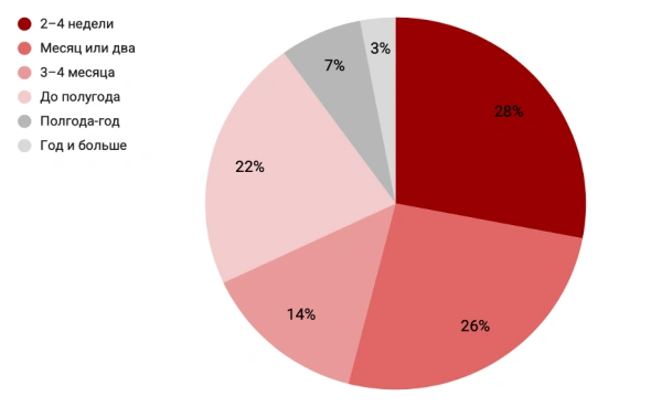 Реже участники опроса называли более длительные сроки продажи жилья. Так, 7% респондентов полагают, что срок продажи квартиры должен составлять от полугода до года. Лишь 3% думают, что на это уйдет год и более.