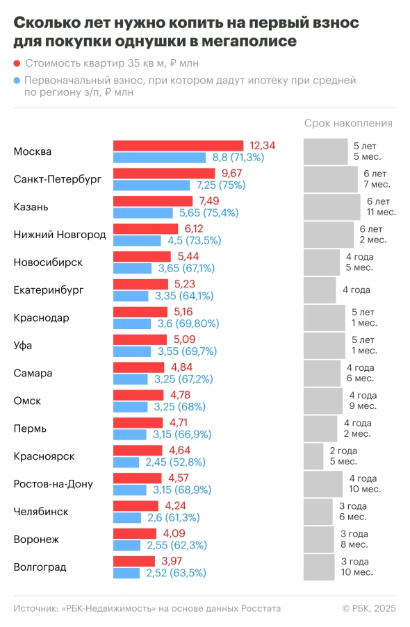 В остальных миллионниках на первоначальный взнос понадобится 63,5–69,8% от стоимости квартиры, а накопления займут примерно 4–5 лет, подсчитала «РБК-Недвижимость».