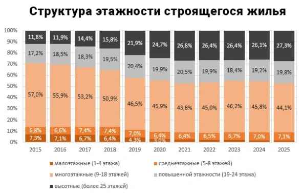 В 2025 году 20% российских новостроек имеют повышенную этажность (19-24 этажа), а более четверти (27%) строящихся многоквартирных домов являются высотками (свыше 25 этажей), подсчитали аналитики. Абсолютным лидером по высотности новостроек является Москва, где средняя этажность строящего дома превышает 31 этаж. Также в тройку лидеров входят Свердловская область (почти 23 этажа в среднем) и Ингушетия (более 22 этажей).