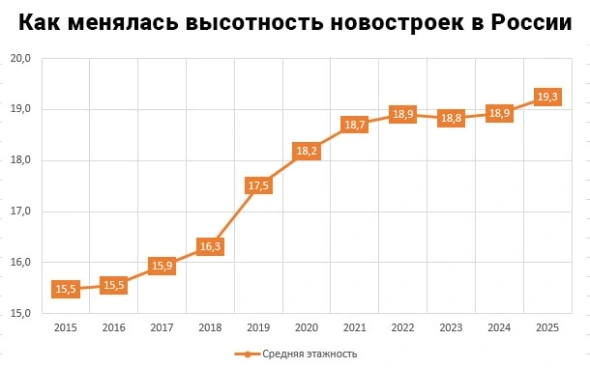 За последние десять лет средняя высота строящихся в России жилых домов увеличилась с 15,5 этажей в 2015 году до 19,3 этажей в 2025 году. Такие данные содержатся в предоставленном редакции аналитическом исследовании Единого ресурса застройщиков (ЕРЗ).