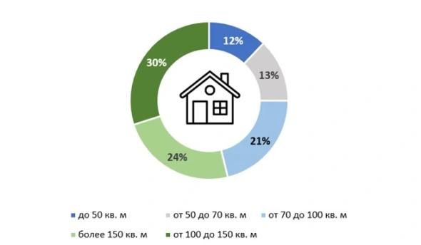 Аналитики «Домклик» отдельно рассмотрели структуру предложения загородного жилья. В этом сегменте рынка медианная площадь лота в экспозиции составляет 100 кв. м, что соответствует предпочтениям большинства опрошенных россиян.