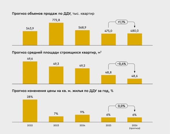 По итогам 2025 года эксперты ожидают продажи новостроек на уровне 475 тыс. договоров долевого участия (ДДУ), что почти на 17% ниже показателей прошлого года (568,9 тыс. ДДУ). В следующем году спрос на новостройки останется примерно на уровне этого года. Согласно прогнозу аналитиков, в 2026-м продажи будут на уровне этого года и составят 480 тыс. ДДУ. Спрос на ипотеку в 2026 году вырастет на 10% — общий прогнозируемый объем выдачи составит 2,2 трлн руб., указывают эксперты.