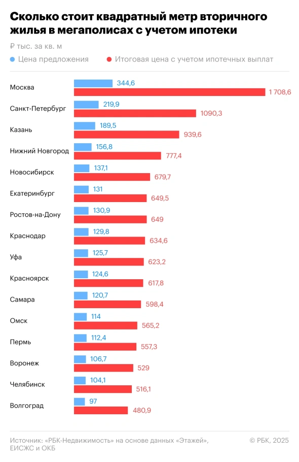 На середину 2025 года средняя стоимость квадратного метра жилья в российских мегаполисах в среднем составляет около 130 тыс. руб. Однако с учетом ипотечных выплат она дорастет до 640 тыс. руб., причем в семи мегаполисах сумма превысит это значение.