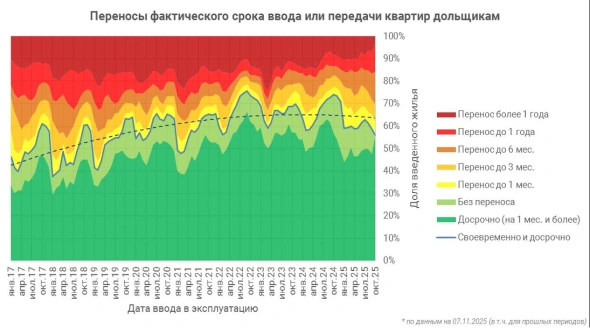 За последний год застройщики стали чаще сдавать новостройки с задержкой. По данным портала «ЕРЗ.РФ», в третьем квартале 2025 года относительно аналогичного периода 2024 года доля жилья, сданного с переносом срока, увеличилась с 28,2 до 38,7%. Одновременно снизилась доля досрочно сданного жилья — с 63,2% в третьем квартале 2024 года до 49,7% в третьем квартале 2025 года. При этом средний срок переноса за год сократился с пяти с половиной до пяти месяцев по итогам третьего квартала 2025 года.