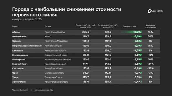 Первое место по снижению цен на новостройки в период с января по конец апреля 2025 года занял Абакан, следует из предоставленного редакции пресс-службой Сбербанка исследования аналитиков «Домклик».