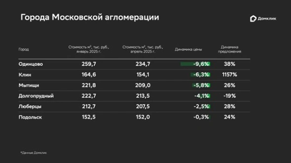 Данные приводятся по ценам предложения на витрине «Домклик» в объявлениях, актуальных на начало января и на конец апреля 2025 года. В выборке участвовали как региональные центры, так и небольшие курортные города. Дополнительно аналитики рассчитали ценовую динамику в городах Московской агломерации, где также зафиксировано снижение цен на новостройки.