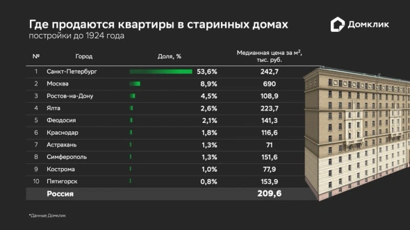 Статистика приводится по ценам предложения на витрине «Домклик» в объявлениях, актуальных на июнь 2025 года. Доля исторической застройки рассчитывалась как отношение объявлений о продаже квартир в домах, построенных не позже 1924 года в каждом городе, к общему предложению в старинных домах на «Домклик». Учитывались города из топ-10 по предложению исторической застройки — на них в совокупности пришлось порядка 78% всех квартир в историческом фонде.