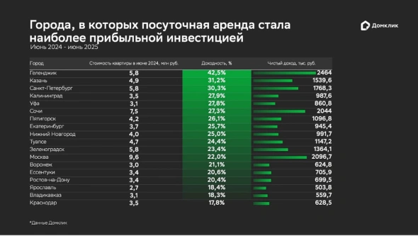 Краткосрочная аренда стала наиболее прибыльной инвестицией в большинстве городов-миллионников и туристических городах, следует из предоставленного редакции пресс-службой Сбербанка исследования аналитиков «Домклик». Лидером по доходности стал Геленджик — по итогам года сдача квартиры посуточно принесла доходность на уровне 42,5%.
