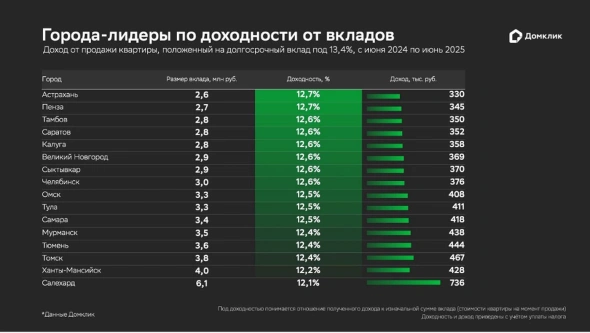 В «Домклик» уточнили, что в таких городах, как Саратов, Тверь, Омск, Тула и Салехард, доходность от вклада незначительно превышает доходность от долгосрочной аренды (на 1–1,5%). В этих городах долгосрочная аренда сохраняет конкурентоспособность, особенно если квартира обладает потенциальной востребованностью на рынке.