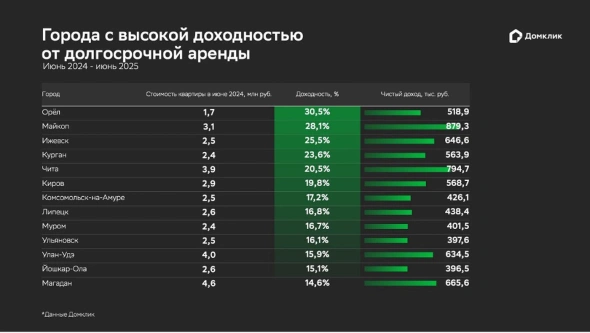 В Комсомольске-на-Амуре, по данным «Домклик», доходность составила 17,2%. В Липецке и Муроме показатели практически идентичны — 16,8% и 16,7%, как и в Ульяновске (16,1%) и Улан-Удэ (15,9%). Замыкают данный рейтинг Йошкар-Ола (15,1%) и Магадан (14,6%). Хотя Магадан и занимает последнее место в процентном отношении, по чистому доходу от долгосрочной аренды (665,6 тыс. руб.) этот город уступает лишь Майкопу (879,3 тыс. руб.) и Чите (около 795 тыс. руб.).