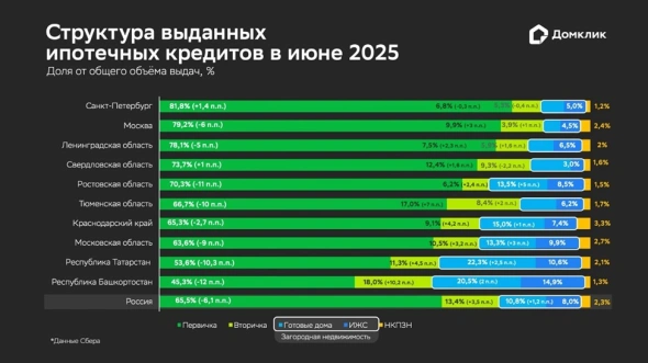 Статистика «Домклик» показывает, что в июне объем выдач по новостройкам составил 130 млрд руб. (снижение к маю — 1,7%). Доля первичного сегмента в выдачах Сбербанка тоже сократилась — на 6,1 п.п., составив по итогам месяца 65,5%. «Это напрямую связано с небольшим сокращением доли льготных программ, которые, как известно, в основном предназначаются для первичного жилья», — пояснили эксперты. Самая высокая доля первичного сегмента отмечена в Санкт-Петербурге (81,8% всего ипотечного спроса) и Москве (79,2%). Первую тройку замкнула Ленинградская область (78,1%).