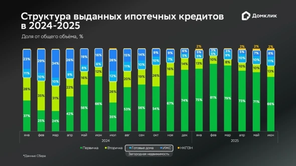 Доля вторичного рынка в выдачах Сбербанка снизилась: с 20% в июле — декабре 2024 года до 11% в январе — июне 2025-го. Аналитики «Домклик» связывают это с высокими рыночными ставками на фоне действующей ключевой ставки ЦБ.