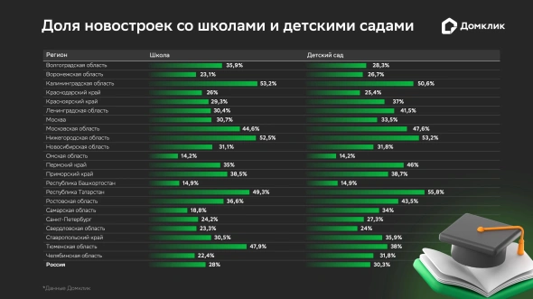 Как показывает статистика «Домклик», лидерами по обеспеченности новых жилых комплексов школами среди рассмотренных регионов являются Калининградская (53,2%) и Нижегородская (52,5%) области, Республика Татарстан (49,3%), Тюменская (47,9%) и Московская (44,6%) области. По обеспеченности детскими садами лидируют Татарстан (55,8%), Нижегородская (53,2%), Калининградская (50,6%), Московская (47,6%) области и Пермский край (46%).