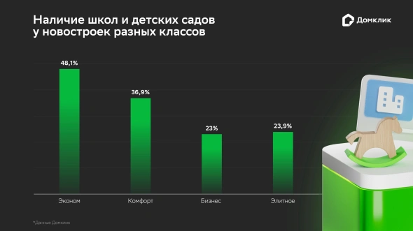 В «Домклик» отдельно рассмотрели обеспеченность детской образовательной инфраструктурой в ЖК различных ценовых сегментов. Выше всего показатели в экономклассе — дошкольные и среднеобразовательные учреждения есть в 48,1% таких проектов. В комфорт-классе показатель составляет 36,9%, в бизнес-классе — 23%, в премиальных проектах — 23,9%.