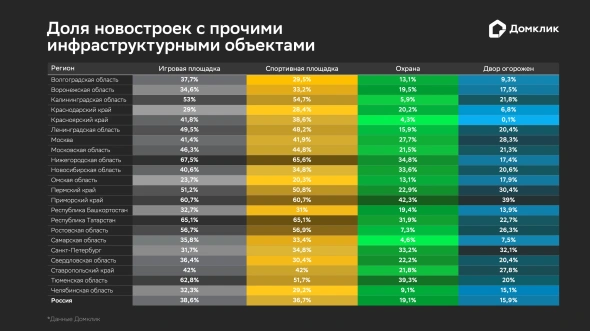 Эксперты также составили рейтинг самых распространенных объектов детской инфраструктуры на территории новых ЖК в первичном предложении. Первое место — у детских игровых площадок, которые есть в 38,6% проектов. В число регионов — лидеров по этому показателю входят Нижегородская область (67,5%), Республика Татарстан (65,1%) и Тюменская область (62,8%).