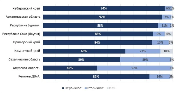 «Доля вторичного жилья составила 16% (-2 п.п.) относительно четвертого квартала 2024 года, — отметили в «Домклик». — Самая высокая доля готового жилья, оформленного в ипотеку по «Дальневосточной и арктической ипотеке», была отмечена в Амурской области (57%)». Относительно высокие показатели также зафиксированы в Сахалинской области (около 40%) и Камчатском крае (27%).