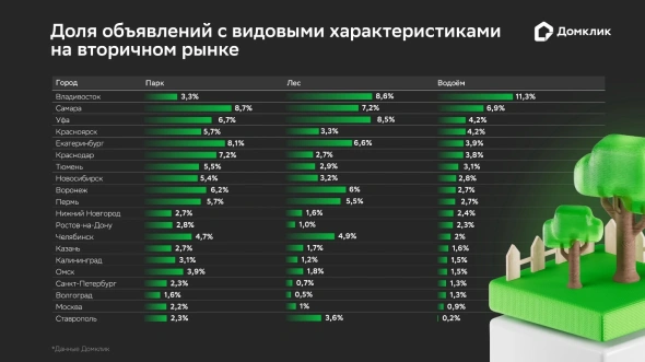 Что касается конкретных видовых характеристик, больше всего предложений жилья с окнами, выходящими на парк, отмечено в Самаре (8,7%), Екатеринбурге (8,1%) и Краснодаре (7,2%). В топ-3 городов с окнами на лес входят Владивосток (8,6%), Уфа (8,5%) и Самара (7,2%). Квартир с видом на водоем больше всего во Владивостоке (11,3%), Самаре (6,9%) и Уфе (4,2%).