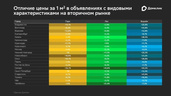 В число городов, где видовые характеристики дают максимальную надбавку к цене «квадрата» (от 20 до 50% при виде на водоем), вошли Самара, Ставрополь, Омск, Новосибирск и Нижний Новгород. В Санкт-Петербурге такой вид прибавляет к цене 12,3%, в Москве — 6,6%.