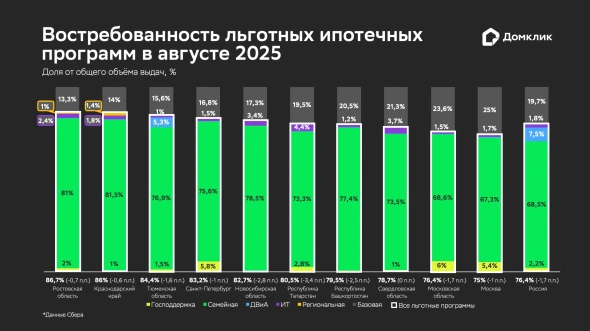 В «Домклик» также обращают внимание, что спрос на льготную ипотеку остается стабильно высоким — во многом за счет семейной госпрограммы. По итогам августа доля программы «Семейная ипотека» в общих выдачах «Сбера» снизилась на 1,2 п.п., при этом объем выдач по ней вырос на 15% — до 183 млрд руб. В числе регионов-лидеров по доле «Семейной ипотеки» в выдачах — республики Хакасия (89,4%) и Адыгея (89,3%), а также Астраханская область (85,8%).