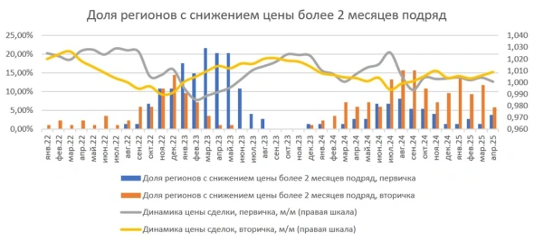 Отдельно в исследовании рассматривается ценовая динамика на горизонте нескольких месяцев. Эксперты указывают, что в апреле увеличилось число регионов, где на протяжении трех и более месяцев снижаются цены на новостройки. «Достаточно высоким остался этот показатель и на вторичном рынке. Это может свидетельствовать о том, что отдельные региональные рынки уже не могут поддерживать цены в условиях падающего спроса», — поясняется в исследовании.