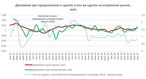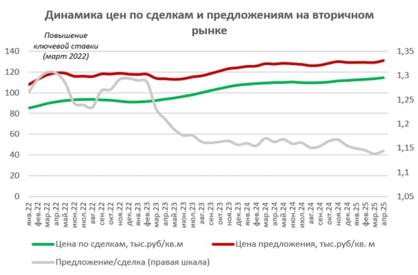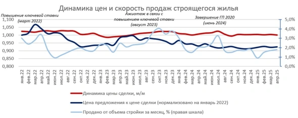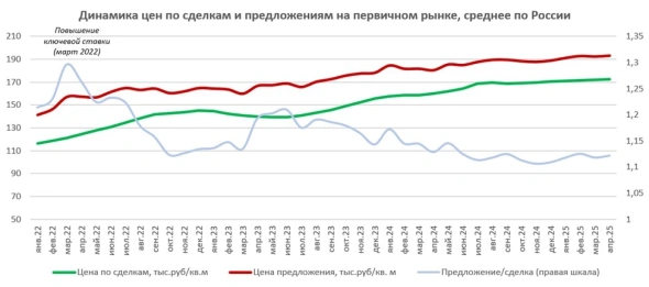 В исследовании также содержится прогноз по ценам. Эксперты «Домклик» и ЦФА отмечают, что годовые темпы роста цен снижаются: так, в апреле 2025 года средняя стоимость первичного «квадрата» была на 7,7% выше, чем в апреле 2024-го. В марте этот разрыв составлял 8,4%. Кроме того, доля ежемесячных продаж в течение девяти месяцев не превышает 2% объемов стройки. «Разрыв между ценой предложения и ценой сделки (который показывает степень уверенности продавца) стагнирует. Все это говорит в пользу того, что цены в ближайшие месяцы могут перейти к снижению или зафиксироваться на текущем уровне», — заключают аналитики.