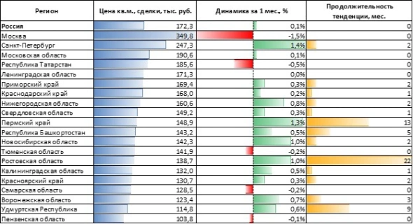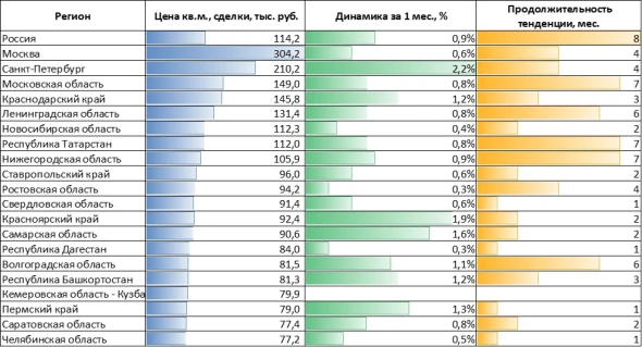Самая низкая стоимость 1 кв. м вторичного жилья среди крупнейших регионов отмечена в Челябинской (77,1 тыс. руб.) и Саратовской (77,4 тыс. руб.) областях, а также в Пермском крае (79 тыс. руб.). Месячный рост цен зафиксирован как в регионах — лидерах по уровню цен, так и в регионах с минимальными показателями.
