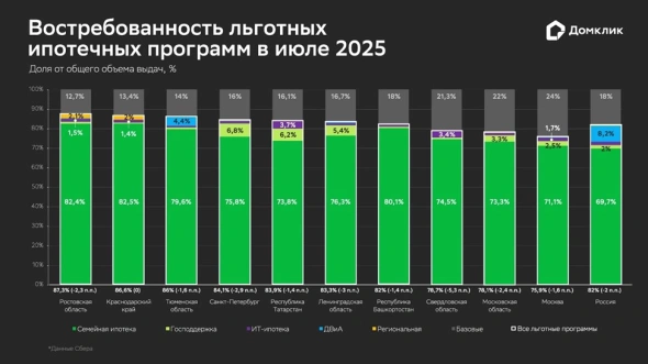 Доля льготной ипотеки в выдачах Сбербанка в июле составила 82% (минус 2 п.п. за месяц). В «Домклик» подчеркивают, что в течение всего 2025 года спрос на госпрограммы остается высоким: за исключением января, их доля стабильно превышала 80%.