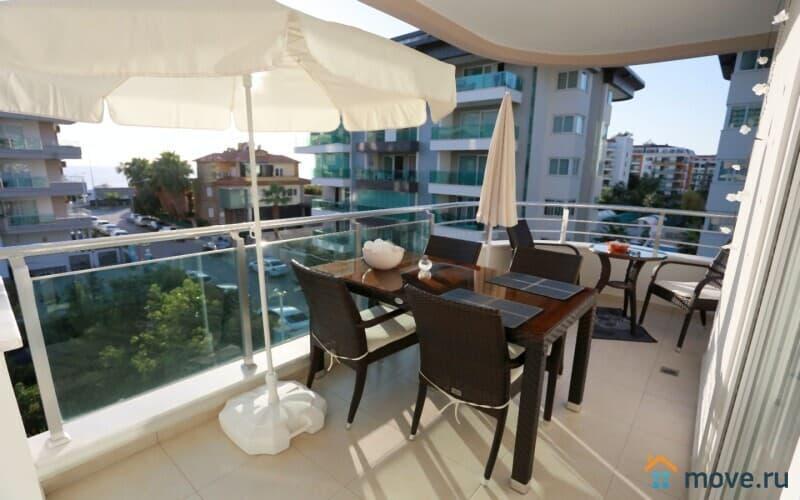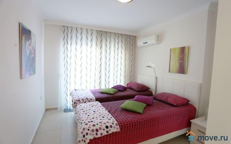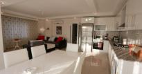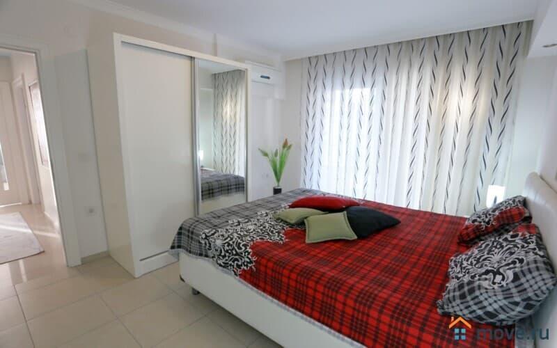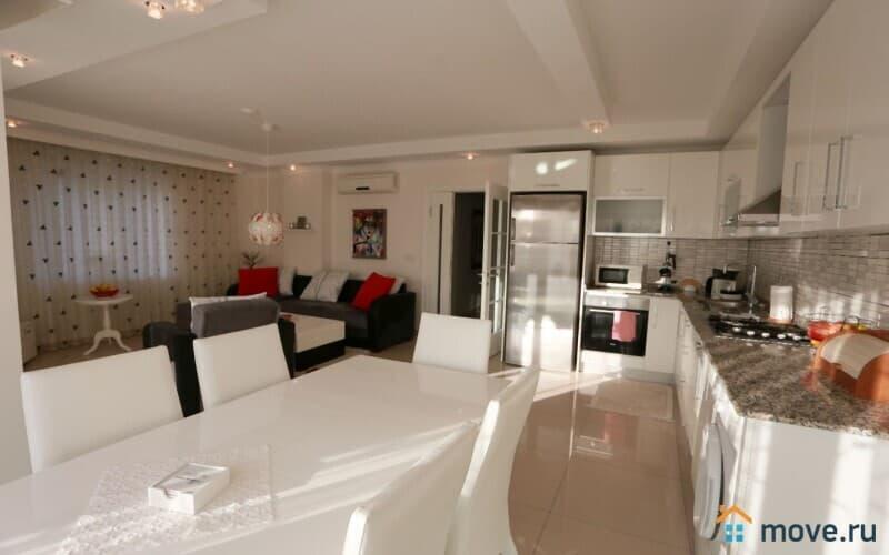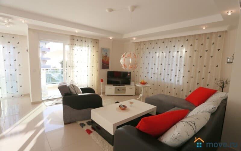 Планировка включает: просторную светлую гостиную с полностью оборудованной кухонной зоной с бытовой техникой, две уютные спальни, два совмещенных санузла и большого балкона, откуда открываются захватывающие виды на Средиземное море и горы Таурус.