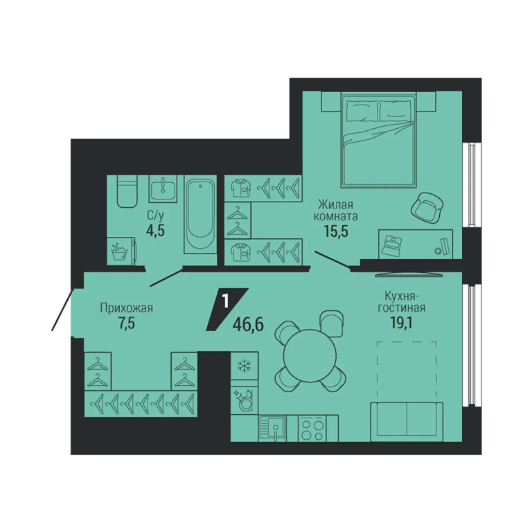 • Общая площадь: 46.6 м2