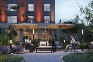 Двор с ландшафтным озеленением разделен на три зоны. Для детей – игровые площадки с меловыми досками и уличными шахматами, для взрослых – лаунж-зона с креслами и столиками для отдыха, для спортсменов – воркаут-площадка. На первом этаже – лобби-клуб с игровыми комнатами, залом для йоги, коворкингом и мини-кинотеатром, колясочные и велосипедные помещения.