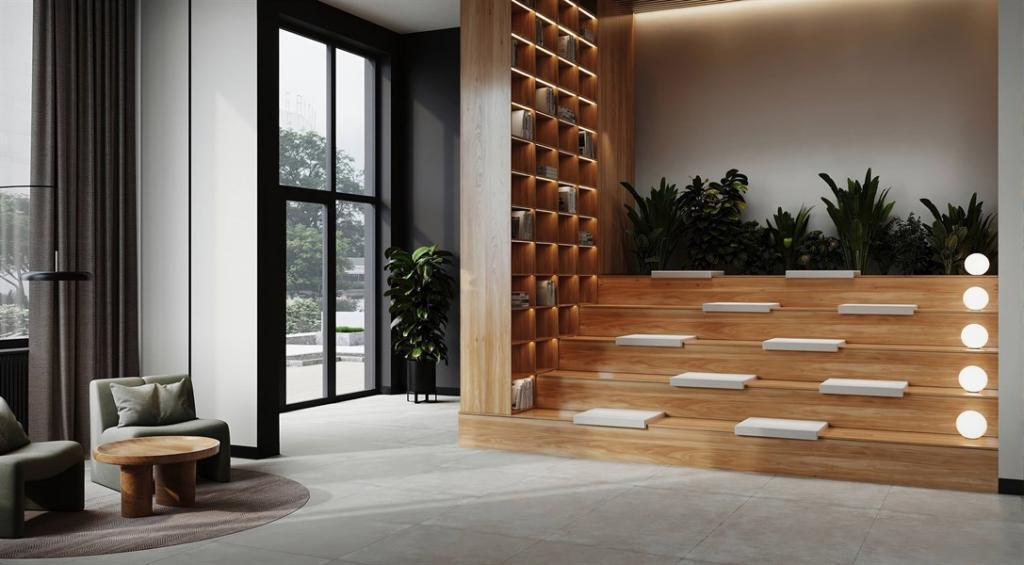 Двор с ландшафтным озеленением разделен на три зоны. Для детей – игровые площадки с меловыми досками и уличными шахматами, для взрослых – лаунж-зона с креслами и столиками для отдыха, для спортсменов – воркаут-площадка. На первом этаже – лобби-клуб с игровыми комнатами, залом для йоги, коворкингом и мини-кинотеатром, колясочные и велосипедные помещения.