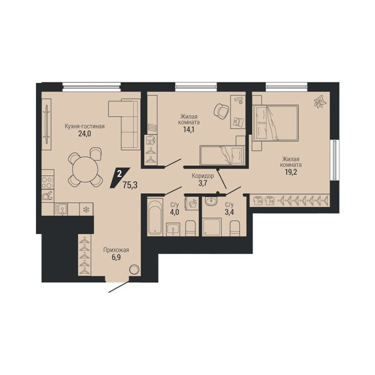 • Общая площадь: 75.3 м2
