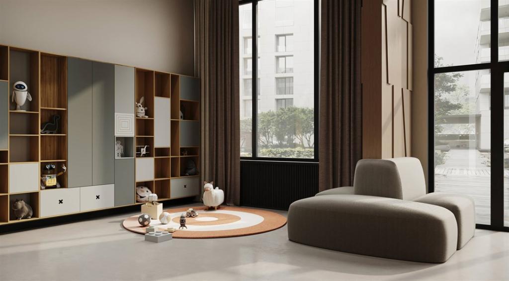 Двор с ландшафтным озеленением разделен на три зоны. Для детей – игровые площадки с меловыми досками и уличными шахматами, для взрослых – лаунж-зона с креслами и столиками для отдыха, для спортсменов – воркаут-площадка. На первом этаже – лобби-клуб с игровыми комнатами, залом для йоги, коворкингом и мини-кинотеатром, колясочные и велосипедные помещения.