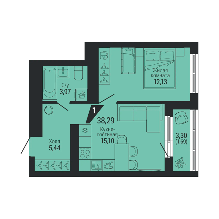 • Общая площадь: 38.29 м2