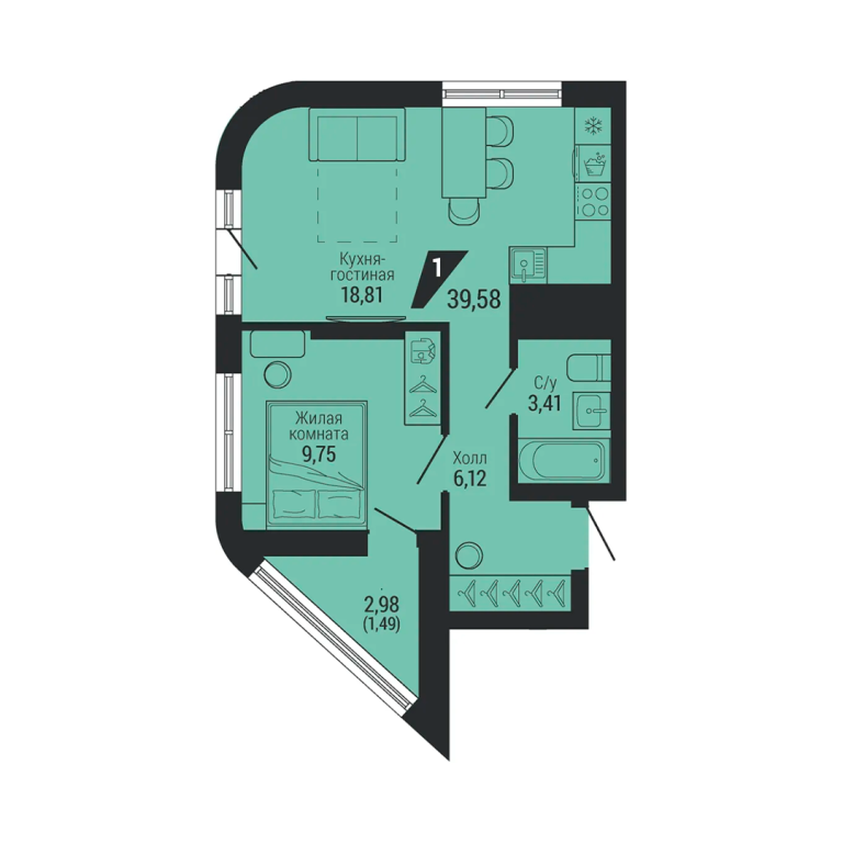 | Общая площадь: | 39.58 м2 |