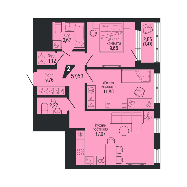 | Общая площадь: | 57.63 м2 |