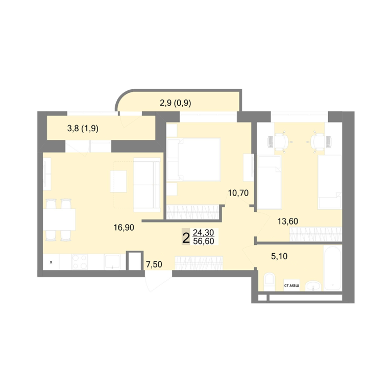 | Общая площадь: | 56.6 м2 |