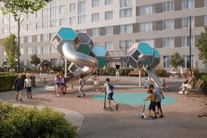 Живые зелёные изгороди защитят жителей первых этажей от посторонних взглядов. Уютный сад с плитняковыми тропинками, перголами и столиками подойдёт для семейных вечеров и встреч с друзьями. Вдоль дорожек установят невысокие фонари. По периметру двора появится велодорожка. Игровые площадки покроют травмобезопасной резиновой крошкой. Малые архитектурные формы: